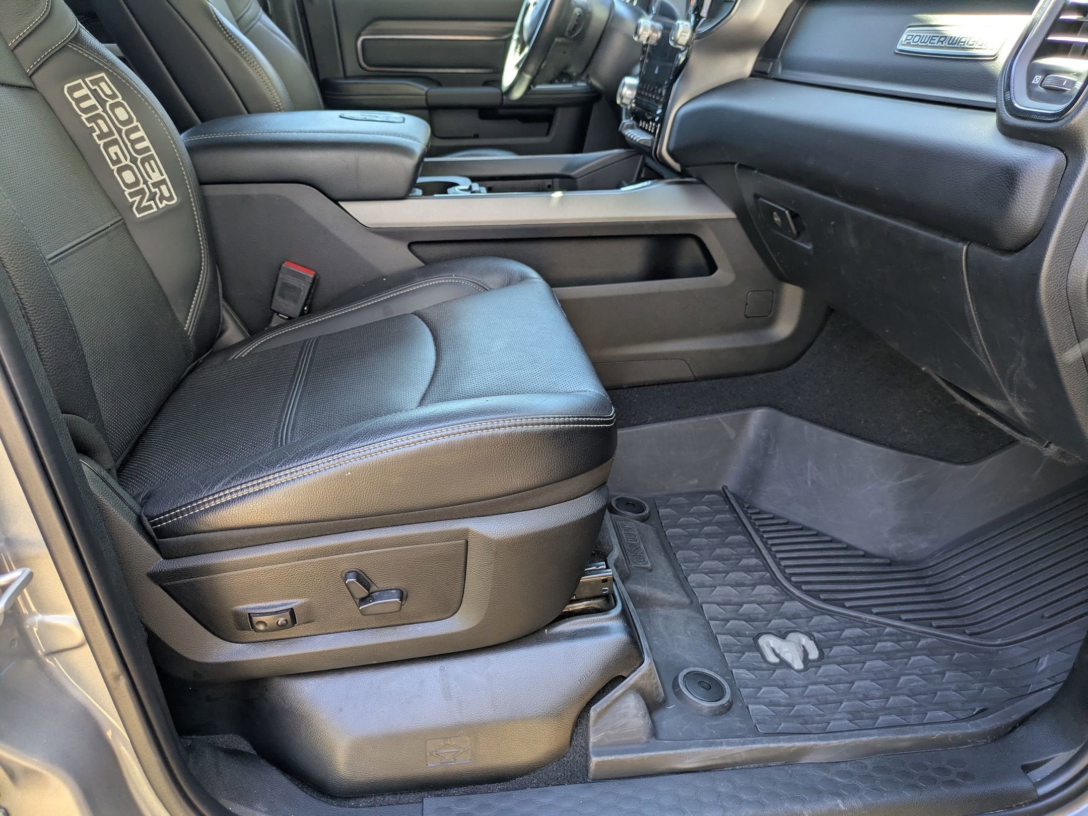 Level 1 Equipment Group, leather seating, 12 inch Uconnect touchscreen with Apple CarPlay and Android Auto, 6.4L HEMI V8, electronic locking front and rear differentials, factory 12,000 lb Warn winch, disconnecting front sway bar, off road suspension, skid plates, backup camera, and bold Power Wagon styling.